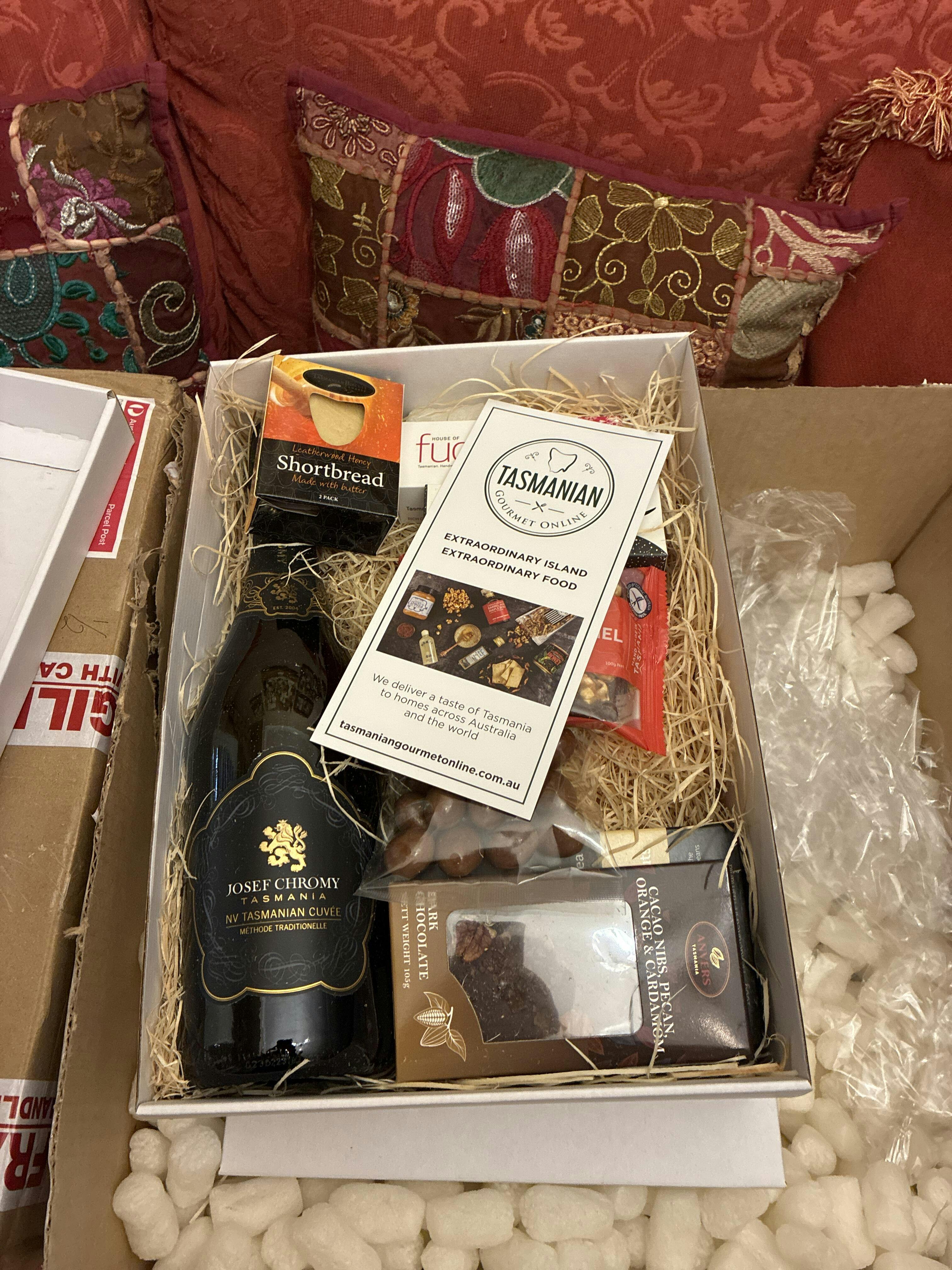 This hamper is a perfect celebration gift! The fresh citrus and green apple notes of the Josef Chromy Tasmanian Cuvee is well matched with a collection of gourmet treats from all our across our Island. House of Fudge Christmas fudge and Federation dark cacao chocolate walnut , Larder-lish-us chocolate coated walnuts and gourmet fudge will delight! The Nutpatch muesli bar is sublime, and the popular Divine Addictions panforte goes beautifully with Elly’s salted caramel bang.